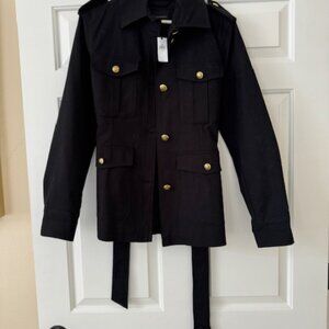 This Banana Republic utility jacket in classic black offers a structured silhouette with a belted waist for a tailored fit. Crafted from durable materials, it serves as a versatile piece for transitional weather, providing both style and functionality.