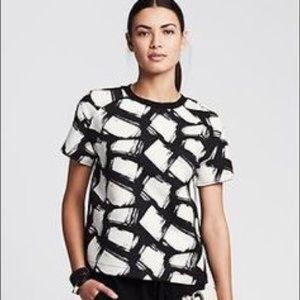 EUC structured blouse from Banana Republic! It has a black and white painterly print (think brush strokes) with black crew neck and black stretchy panels down both sides. I absolutely love this blouse and the boxy fit, but I can't wear printed tops for work so I have no need for it! It's perfect for business casual and can be transitioned for GNO 😉