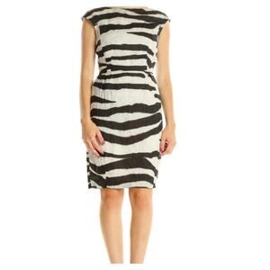 Striking Banana Republic sleeveless sheath dress in a bold black and white zebra print. Features a flattering tailored silhouette with cap sleeves, full lining in taffeta, and a back zip closure. Made from 100% linen for breathable summer style. Fully lined in acetate. Size 0.
