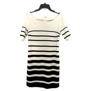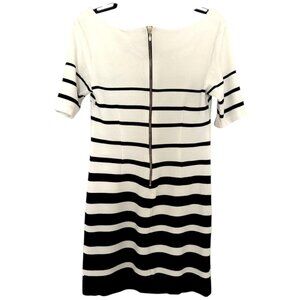 Chic mini dress with bold black and cream stripes. Short sleeves and a flattering fit. Ideal for versatile styling.