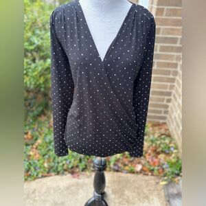 Elegant black wrap top with white polka dots. Features a flattering V-neckline. Perfect for any occasion.