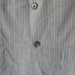 This Banana Republic blazer sports coat is designed for men in size 44 with a sophisticated gray pinstriped pattern. The blazer features a two-button closure and is made from cotton canvas material with acetate lining for comfort. Suitable for various occasions such as travel, workwear, or formal events, this blazer also includes accents like buttons and multiple pockets for practicality. Ideal for all seasons, this classic piece showcases a timeless style perfect for a polished look in various settings, from business to casual wear.