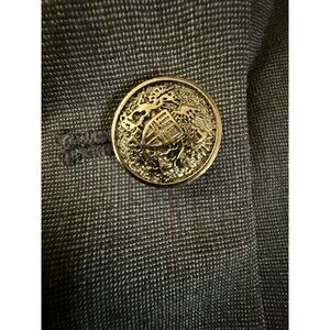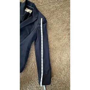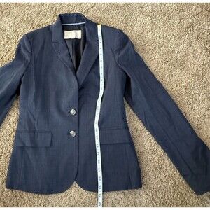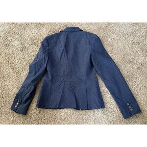The Banana Republic Blazer in women's size 2 is a classic suit jacket in navy blue, made from a wool spandex blend outer shell material. This solid blazer features a button closure, making it suitable for casual, workwear, and business occasions. The lightweight and single-breasted design make it perfect for the fall weather.