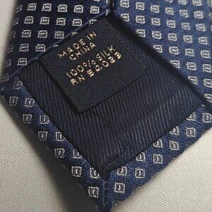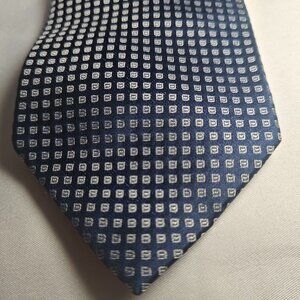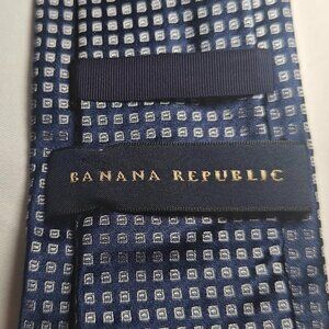 This is a designer Banana Republic men's neck tie made of blue silk blend material. It features an embroidered geometric pattern and is long in length, with a classic width. The tie is not handmade and has a preppy abstract design, suitable for wedding.