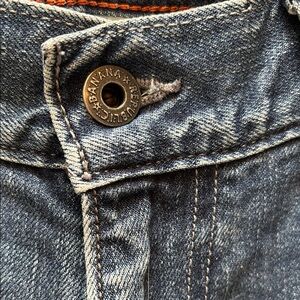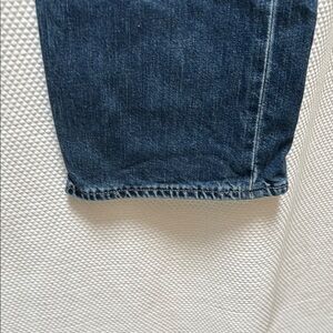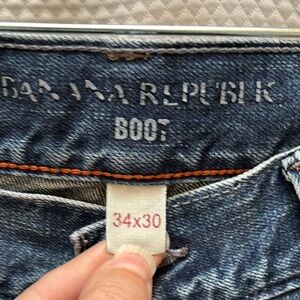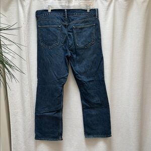 These Banana Republic jeans feature a classic boot-leg design in a rich blue hue, offering a timeless and versatile style. The regular fit through the thigh and leg ensures comfort and ease of movement. Subtle variations in the denim wash provide a slightly worn-in look, complemented by contrasting stitching for added detail.