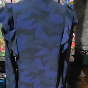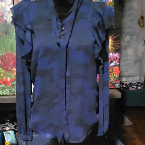 Elegant blouse with a blue pattern and ruffle accents. Ideal for a modern style.