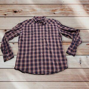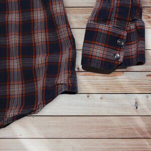 Excellent condition button down shirt from Banana Republic. Has a western feel to it with pearl snap buttons. Blue and orange/red plaid on soft and crisp weave. Collared, long sleeve, and slim fit. No rips, stains, or tears. No cosmetic damage.