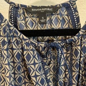 Discover effortless style with this Banana Republic blouse, featuring a relaxed fit and a chic tie front. The sleeveless design in a soothing blue and white palette makes it perfect for warm days. Ideal for both casual outings and more polished occasions, this top is a versatile addition to any wardrobe. 29”L 19”Pit to pit 490