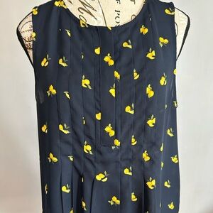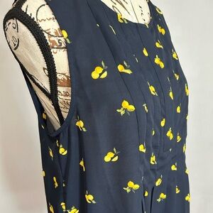 This sleeveless blouse from Banana Republic features a playful yellow lemons print on a navy blue background. With its round neckline and casual style, it's perfect for a summery day.