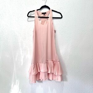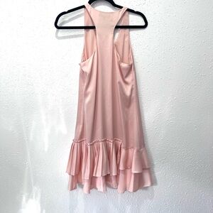 Size USA 2 – Pale dusty pink sleeveless crepe polyester mini-dress with racer back, concealed side zip closure, ruffles at hemline, and pleated detail at one side, and tonal lining.