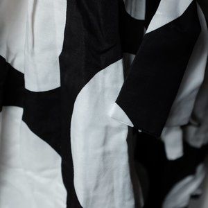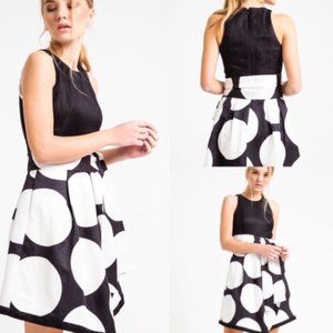 The top of this dress is a form fitting, flattering high neck in solid black. The bottom in a faux wrap with a bold black and white print. Tie waist. Pockets! Great used condition - worn once. I'm happy to steam it before shipping. Looks great for a party or wedding guest outfit.