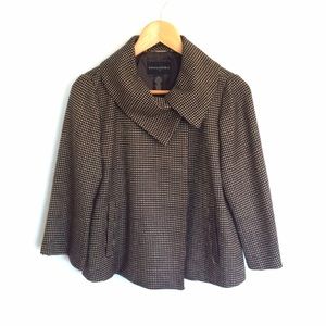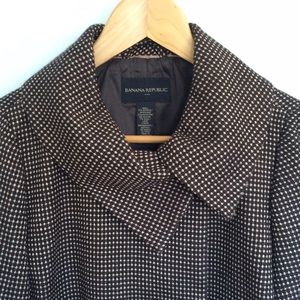 This gorgeous swing jacket features an asymmetrical collar, three-quarter sleeves, and pockets! Button enclosure at the collar (via a cute large button). Fabric is an acrylic (71%) polyester, and wool blend. Made in the Philippines. Fully lined. Banana Republic factory store.