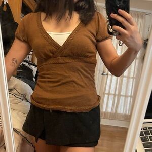 Elegant brown V-neck blouse with short sleeves. Perfect for versatile styling.