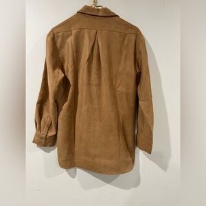 You can wear this jacket as a shirt or as a jacket since it is made of light fabric and has in-line buttons. Brown suede shirt-style jacket, size S overside