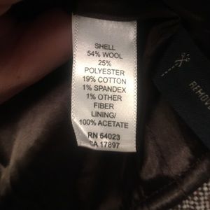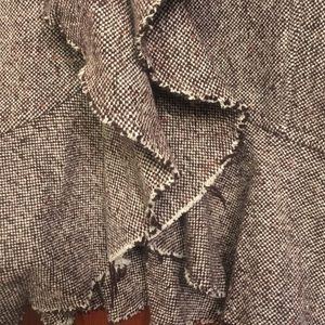 Ruffle front with hook & eye closure. Natural fray detail around bottom hem & ruffle. Gently worn. Wool blend. Dry clean.