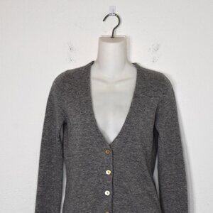 Pre-owned, good condition. No visible holes or stains. Normal signs of wear. Neutral shade of gray. V-neckline. Long sleeves. Button Front. Metallic thread detail at neckline in the back of the neck. Made with Italian yarn. Size per tag: XS (Extra Small). Knit blend: 47% Nylon/ 46% Wool/ 7% Cashmere. Metallic Decoration: 39% Nylon/ 38% Wool/ 11% Polyester/ 6% Cashmere/ 6% Metallic. Hand wash only. Size per tag does not guarantee desired fit, please see pictures for measurements.
