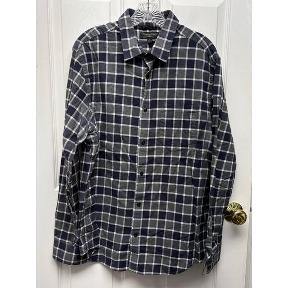 Banana Republic Button Up Plaid Shirt Slim 100% Cotton Black Gray Plaid Men's L