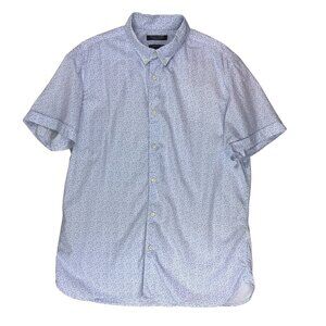 Mens Banana Republic Shirt Size Large Short Sleeve Unlined Button Down Collar Rolled Up Cuff Detail Camden Fit Lightweight Custom 078 Wash Blue Geometric Triangle Dots All Over Print Saved by the bell Rounded bottom hem to wear untucked