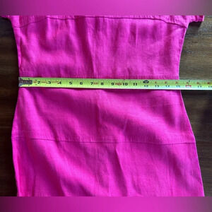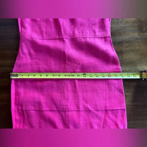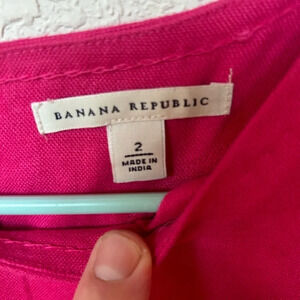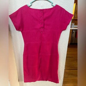 Banana Republic cap sleeve linen dress, with stitching design running across panels, four buttons and zipper closure at the back. Color Pink (actual color is lighter than pictured) size 12, there is a little bit of loose stitching in the inside of the neckline (see pic#12) gently used.