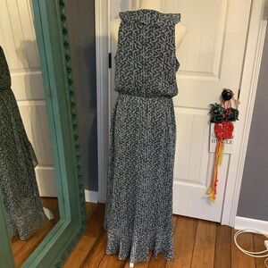 Elevate your wardrobe with this stylish navy maxi dress. Perfect for any occasion, this dress features a flattering, ruffled V-neckline and sleeves for a touch of femininity. The lightweight fabric ensures comfort while maintaining a sophisticated look. - Flattering V-neckline - Elegant grey pattern, suitable for various occasions - - Size medium