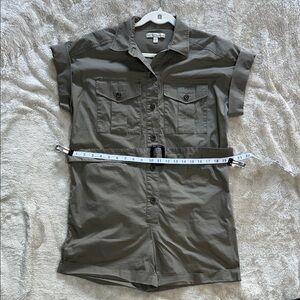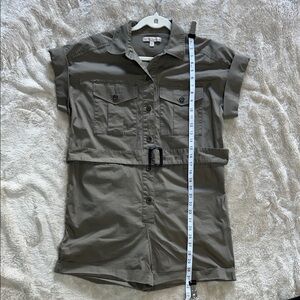 Trendy olive romper featuring a button-up front and a stylish belt. Includes short sleeves and chest pockets.