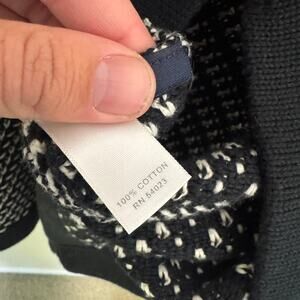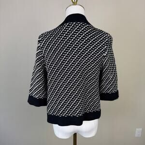 The Banana Republic Knit Shrug offers textured elegance with its chunky cable pattern and versatile short sleeve design. This black and white topper features an open front and cropped silhouette, perfect for layered looks or transitional weather. Note the visible snagging on the sleeve of this otherwise stylish garment. The cozy fabric and refined details provide both comfort and polish, making it ideal for brunch outings, office wear, or adding sophisticated texture to your wardrobe.