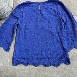 Elegant lace top with scalloped edges. Features three-quarter sleeves.