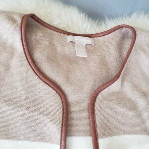 Cozy and sophisticated sweater from Banana Republic. Knitted fabric with faux leather trim details. This cardigan is super elevated and perfect for the office and all your cool weather outings. The camel brown, creamy white, and tan beige colors will match with all of your wardrobe.
