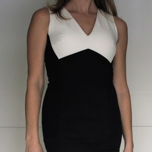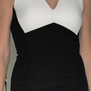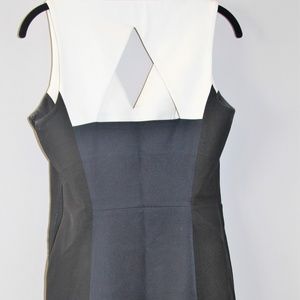 Don't miss out on this black/white/navy colorblock sleeveless cutout dress from Banana Republic. It features a classy v-neck, fun triangle cutout on the back, with navy blue colorblock panels at front and back. Dress is made of Sloan fabric, which is thick and stretchy, and has hidden side zipper. Size 4 dress is in outstanding condition, worn twice, great for work.