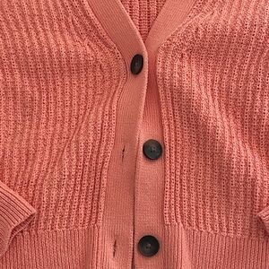 🌿 Tags: cardigan, v-neck sweater, lightweight knit, Banana Republic, classic style, workwear, casual chic, layering piece, spring cardigan, coral cardigan, preppy style