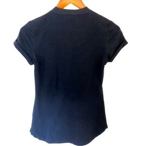 This comfy cotton top is casual like a T-shirt but elevated by a feminine, ruffled front panel of 100% silk with a romantic raw edge. Cuffed short sleeves, hidden front snap closure. 89% cotton; 6% spandex; 5% organic cotton. The color is a true navy, represented best by the photos showing the full shirt. Worn once, with no stains, snags, tears, smells, etc.