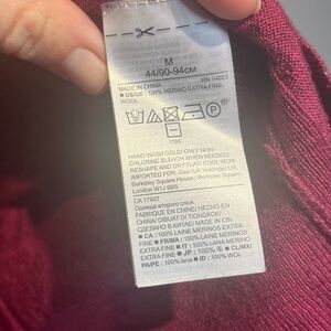 Beautiful cranberry colored lightweight merino wool v-neckk sweater. Great pop of color on a classic style .on small pull on the interior that doesn't show in the exterior. Pwerfect layering piece. Also a greatt background to highlight your accessories on.