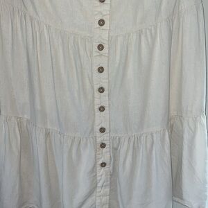 Dreamy! Prairie vibes, Cottagecore, coastal grandma, you name all the asthetics and this covers it! Gorgeous cream partial linen fabric, 3-tiered ruffles, button front, partial lined, perfect for spring, summer, and into fall.