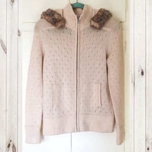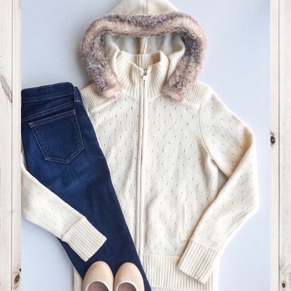Stunning Banana Republic Cream Lambswool Zip Up Cardigan• EUC• Beautiful Cream Color With Eyelet Design• Zip Front Closure• Two Front Slip Pockets• Ribbed Collar, Cuffs & Bottom Of Sweater• Faux Fur Trim On Hood• 100% Lambswool• Faux Fur: 81% Acrylic 19% Polyester• Approximate Measurements: Laying Flat, 17" Underarm To Underarm, 24" Top Of Shoulder To Bottom Of Sweater