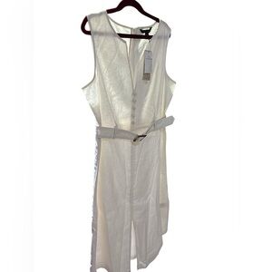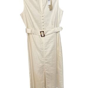 This sophisticated cream sheath dress from Banana Republic features a sleeveless design with a V-neckline and a notched collar. Its tailored silhouette and midi length make it ideal for work or casual occasions, while the belted waist adds a touch of elegance.