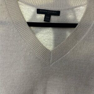 This Banana Republic sweater features a classic V-neck design in a soft cream color, crafted from a lightweight knit for versatile styling. Its minimalist aesthetic and standard fit make it a perfect choice for both casual and formal occasions.