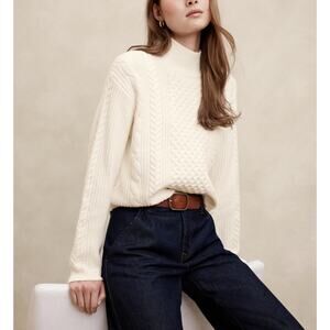 Banana Republic Cream Winter White Cable Knit Sweater Mock Neck preppy fisherman