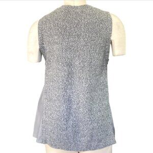 Banana Republic Knit/Faux Leather Vest/Hi-Lo Top in size XS, featuring faux leather side panels and a crew neck. This sleeveless gray vest is crafted from a tight-knit fabric with a relaxed fit, suitable for casual or business occasions. It is collarless, lightweight, and breathable, made of a blend of faux leather and cotton polyester. Ideal for winter and fall, this vest combines hipster, career-wear, preppy, and bohemian styles.