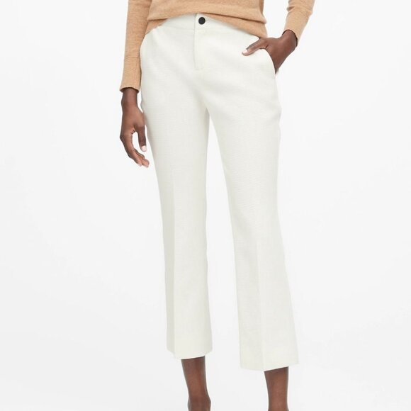 These chic white trousers from Banana Republic feature a cropped flare hem, a textured cotton fabric with stretch, and a button and fly closure. Fabric has texture and is mid-weight.