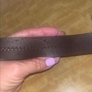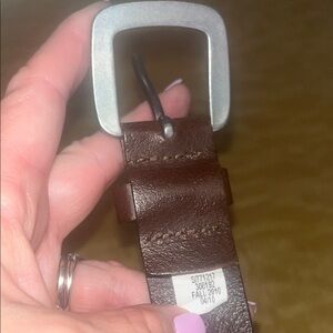 Elegant dark brown leather belt. Features a sleek silver buckle. Ideal for versatile styling. From a smoke free home, preowned.