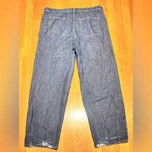 Banana Republic jeans in dark blue denim. Features button fly and contrast stitching.