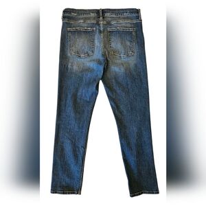 Banana Republic Dark Wash Girlfriend Skinny Jeans - Sz 29/8 - These classic blue jeans offer a timeless look and comfortable fit. They offer a versatile silhouette with a relaxed fit, crafted from comfort-stretch denim. Intentional distressing on pockets and waistband.