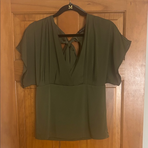 Chic deep olive blouse with a tie-back detail. Flowy short sleeves. Perfect for versatile styling.