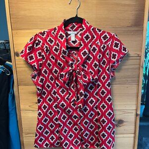 Striking red color with a bold pattern, this top has cap sleeves and a tie front. Flowy and flattering, with a silky feeling. Fits like a large.