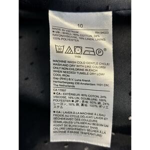 The Banana Republic Double Breasted Cotton Navy Blazer in size 10 is a vintage piece made in Italy. This classic blazer features a solid pattern with a double-breasted design and gold buttons, offering a timeless and sophisticated look. Made from a blend of olefin and cotton, it is lightweight and lined, making it suitable for all seasons.