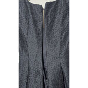 Style: Black embossed fit and flare dress Cocktail dress. Short sleeves and has pockets. zips down the back and has hook and eye clasp. Shell: 90% Polyester 10% Acrylic. Lining: 100% Acetate