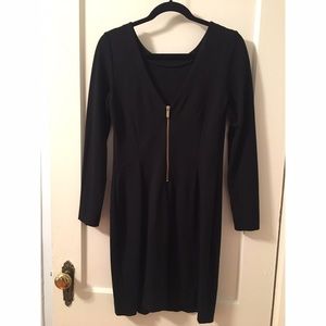 BR black ponte dress with beautiful gold zipper and V back. Hits mid-thigh. Cute with boots and tights! Only worn a few times. Too big for me now.