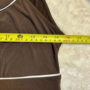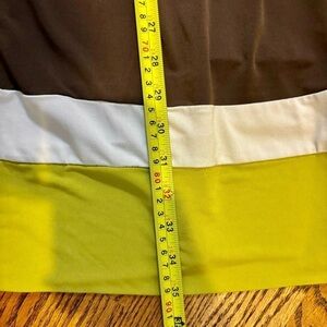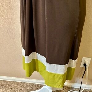 In the Stretch line by Banana Republic, this dress is dark Brown with White piping, and. Colorblock pattern in Avocado Green and White at the bottom Hem.
