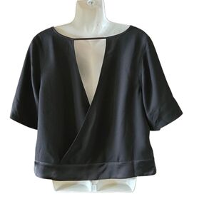 Sophisticated black top with a loose fit. Features half sleeves and a simple round neck. Perfect for any occasion.