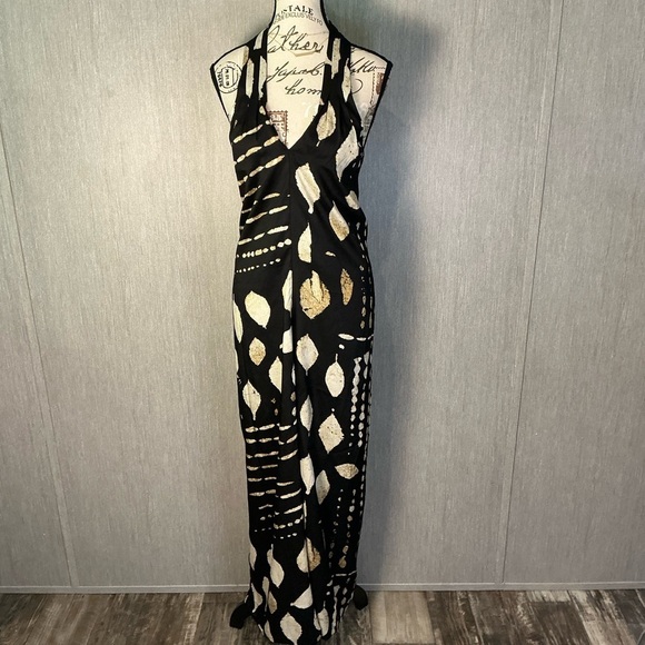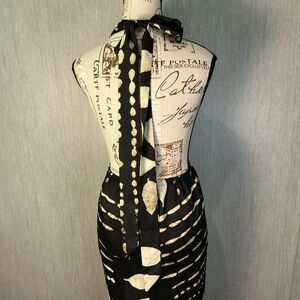 Chic maxi dress with a striking black and cream pattern. Halter neckline adds elegance. Perfect for versatile styling.